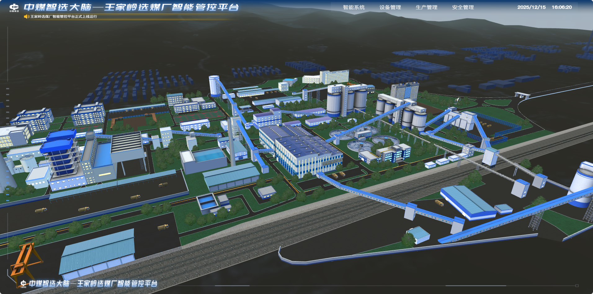 作为中国中煤首个炼焦煤智能化升级项目,王家岭选煤厂的核心突破在于搭建“中煤智选管控平台”。平台通过1:1高精度复刻全厂环境、工艺与设备,将物理工厂无缝映射至数字空间,实现了从宏观全景到微观数据的全面透视。它不仅动态监控着料位、转速、灰分等上千项关键生产指标,更能通过数字孪生体模拟仿真不同原煤的配比方案,提前优化工艺参数、精准预判运行风险,让生产决策从“被动应对”转向“主动预判”。平台还全面集成智能浓缩、智能压滤与智能浮选三大子系统,实现生产数据全程采集、控制信号全面监测、设备运行远程智能调控,有效推动生产管理向远程化、移动化转型,系统灵活性与运营效率显著提升。