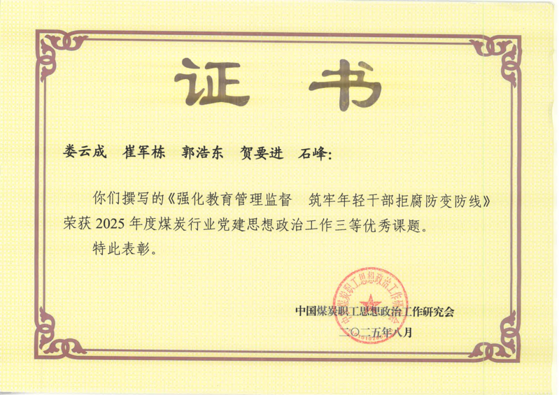 近日,从中国煤炭职工思想政治工作研究会传来喜讯,公司申报的《强化教育管理监督,筑牢年轻干部拒腐防变防线》课题,荣获2025年度煤炭行业党建思想政治工作三等优秀课题。