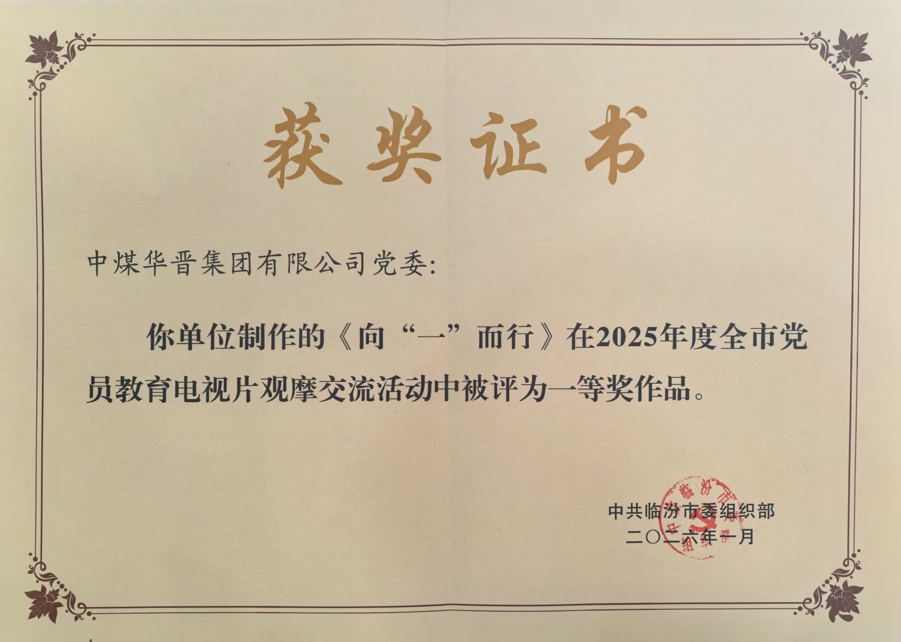 近日,临汾市举办2025年度党员教育电视片观摩交流活动,公司党委积极响应临汾市委组织部号召,报送的《向“一”而行》凭借扎实的内容和严谨的制作,在参评作品中脱颖而出,荣获一等奖。